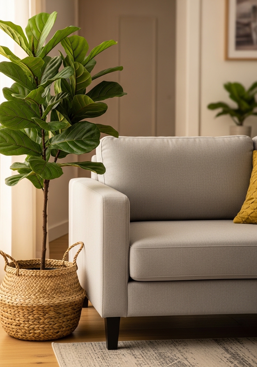 I chose a 6-foot artificial fiddle leaf fig for the corner. It adds height and a calming green without clutter. Real works too if you want low-care plants like a snake plant. Mistake: dotting too many small plants — one statement plant reads cleaner.