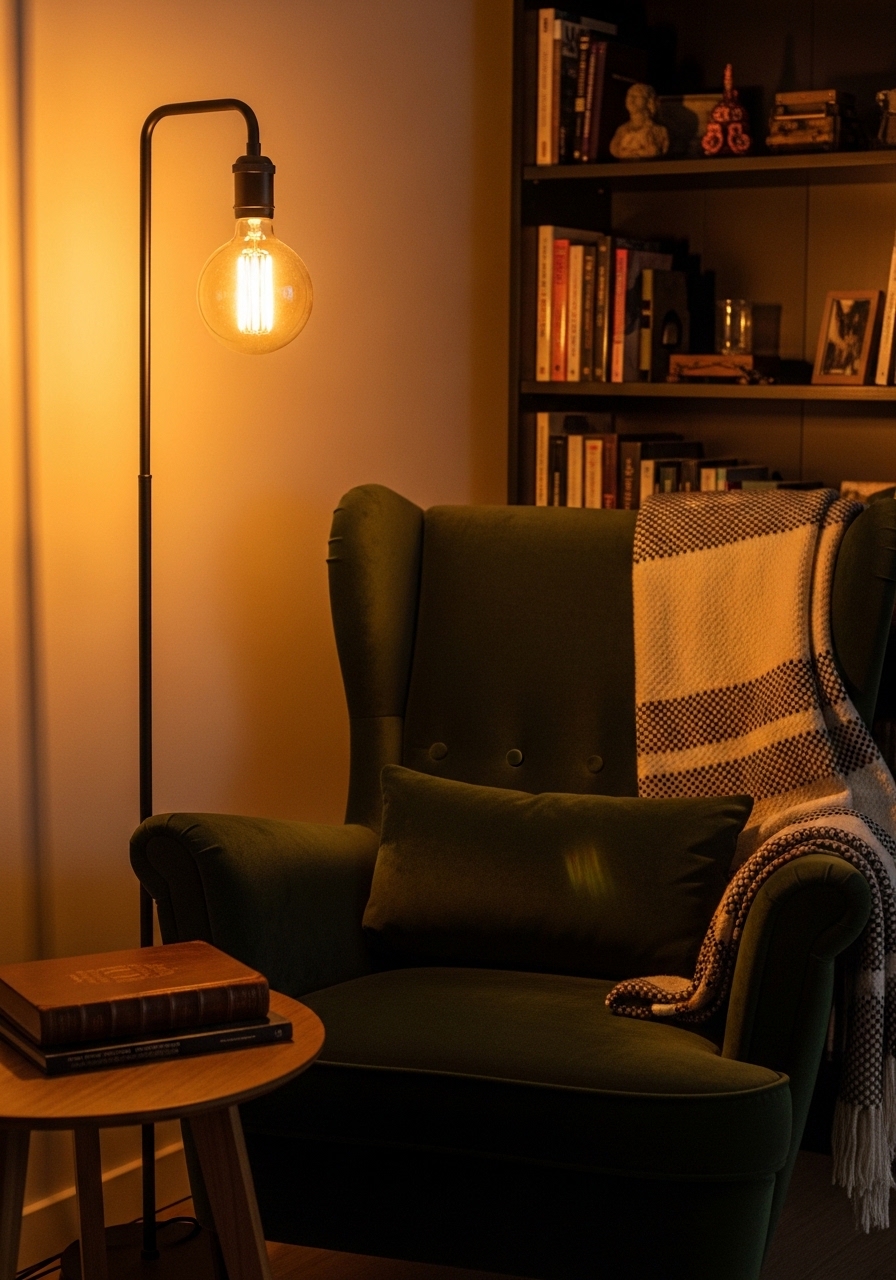 Switch to warm LED Edison bulbs. I swapped all overheads and lamps; the room feels friendlier at night. Layer light sources: floor lamp, table lamp, and dimmable overhead. Mistake: relying on a single overhead—layering matters.