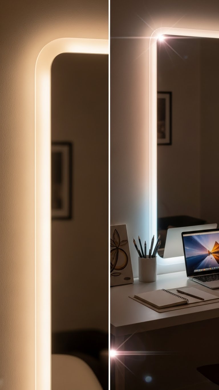 Light up your mirror or desk with slim LED strips to create a soft halo that lifts a room’s mood and adds practical, flattering light for makeup, video calls, or late‑night sketching. You’ll mount strips for subtle ambient glow, use mirror framing for clean edges, and tuck tape for minimalist desk accents.