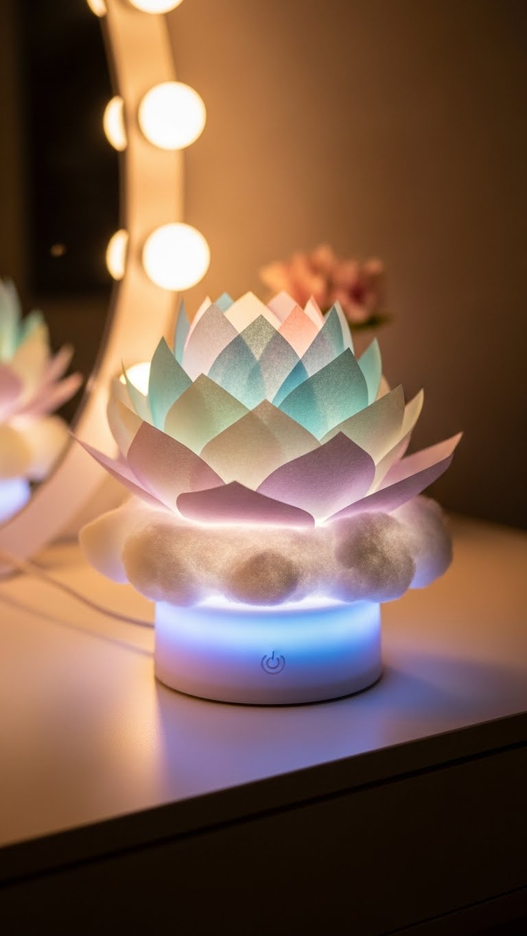 You can carry that same soft, color-shifting glow into a handmade pastel lotus or cloud lamp that becomes a focal point on your vanity or desk. Build airy petals or puffed cotton forms over a low-heat LED base, paint translucent layers for pastel gradients, and diffuse light with vellum. The result: gentle, modern art with soft silhouettes that feels effortlessly free and utterly calming.