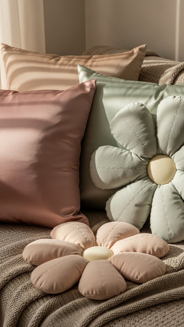 Often overlooked, satin pillowcases and flower throw cushions instantly elevate a soft aesthetic corner with glossy sheen and plush, sculptural accents.