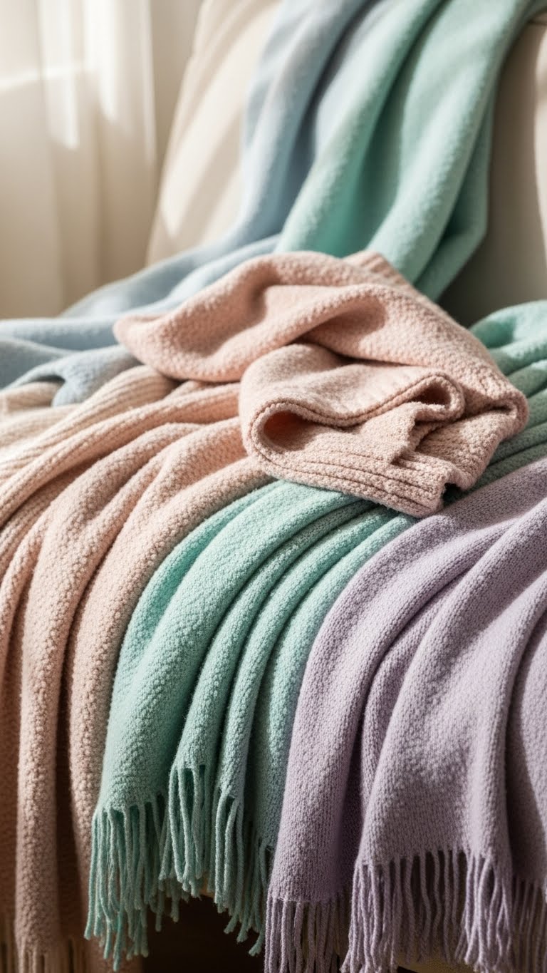 Start by draping two or three lightweight throws in complementary pastels so each layer reads like a soft ribbon of texture and color. You’ll mix soft throws—cotton, linen, fuzzy knit—to build airy, wearable warmth. Let layered textures fall casually over a sofa or chair; tuck corners, let edges peek. It feels effortless, modern, and free—your space, softly curated.
