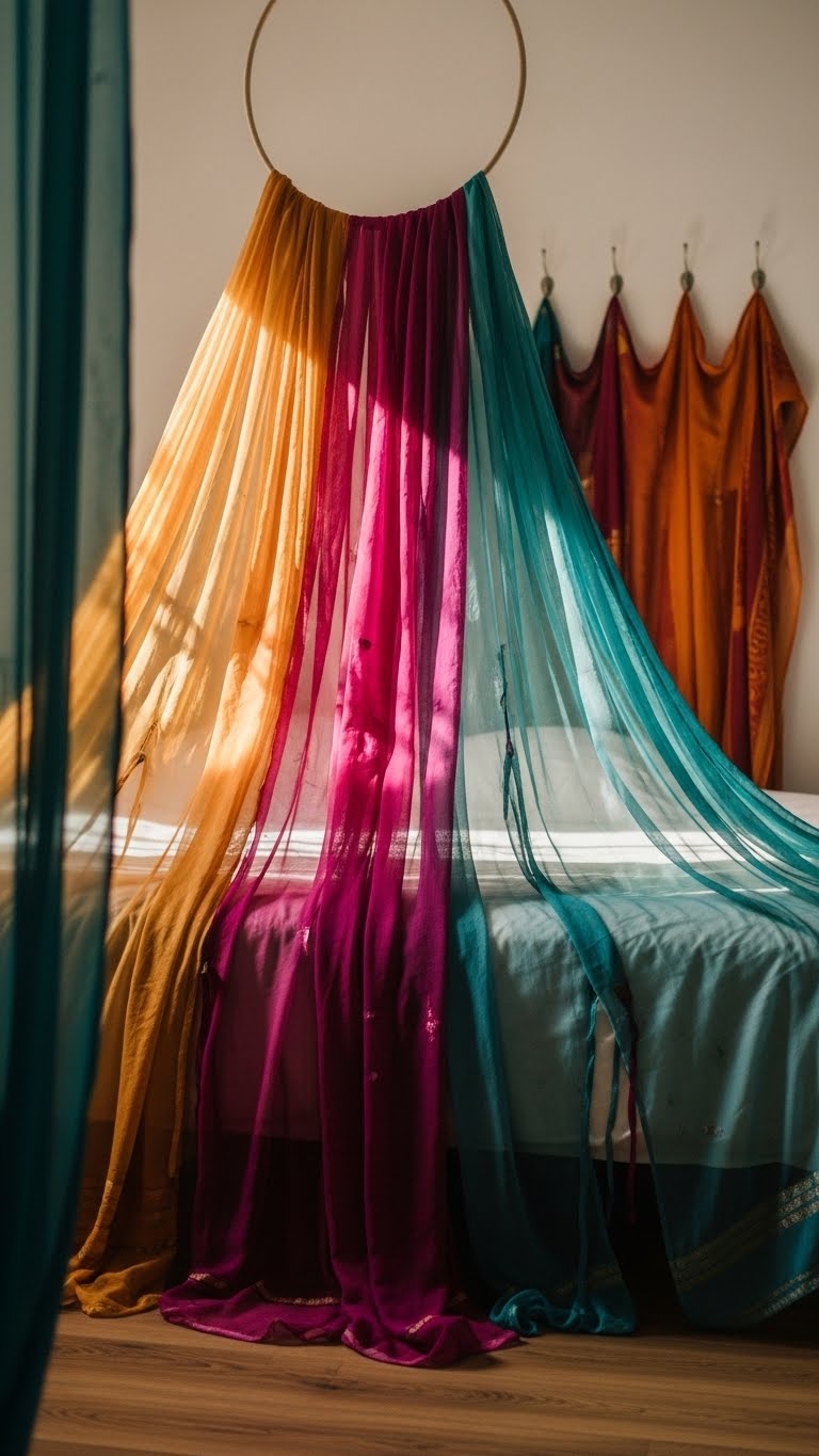 When you drape sheer sari fabric over a simple hoop or a row of hooks, it instantly turns a bed into a soft, romantic retreat—lightweight panels catch the breeze and scatter color in the afternoon sun. You’ll create a draped canopy that feels effortless: secure vintage sari upcycling with hidden ties, let fabric pool lightly, and enjoy a liberated, dreamy nook that’s uniquely yours.