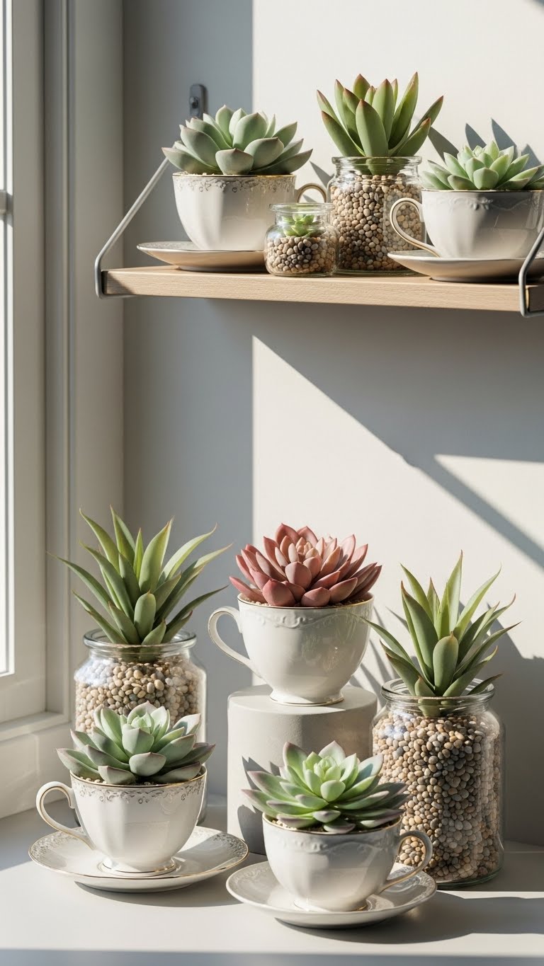 Bring in that low-maintenance greenery vibe with faux succulent planters tucked into vintage teacups and glass jars—easy to style, impossible to kill.