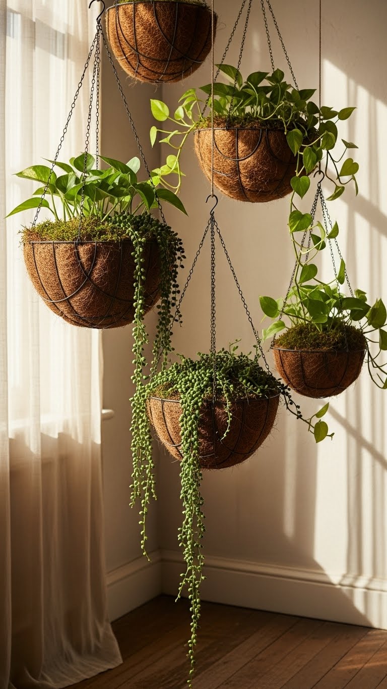 Pick up a thrifted wire or woven basket, line it with moss or a simple coconut coir liner, and let trailing vines spill over the edge for an effortless, floating garden. You’ll hang basket silhouettes at varying heights, letting woven tendrils cascade freely. It’s an easy, liberated vignette — low-cost, modern-romantic, and ready to drift through your soft, sunlit corners.