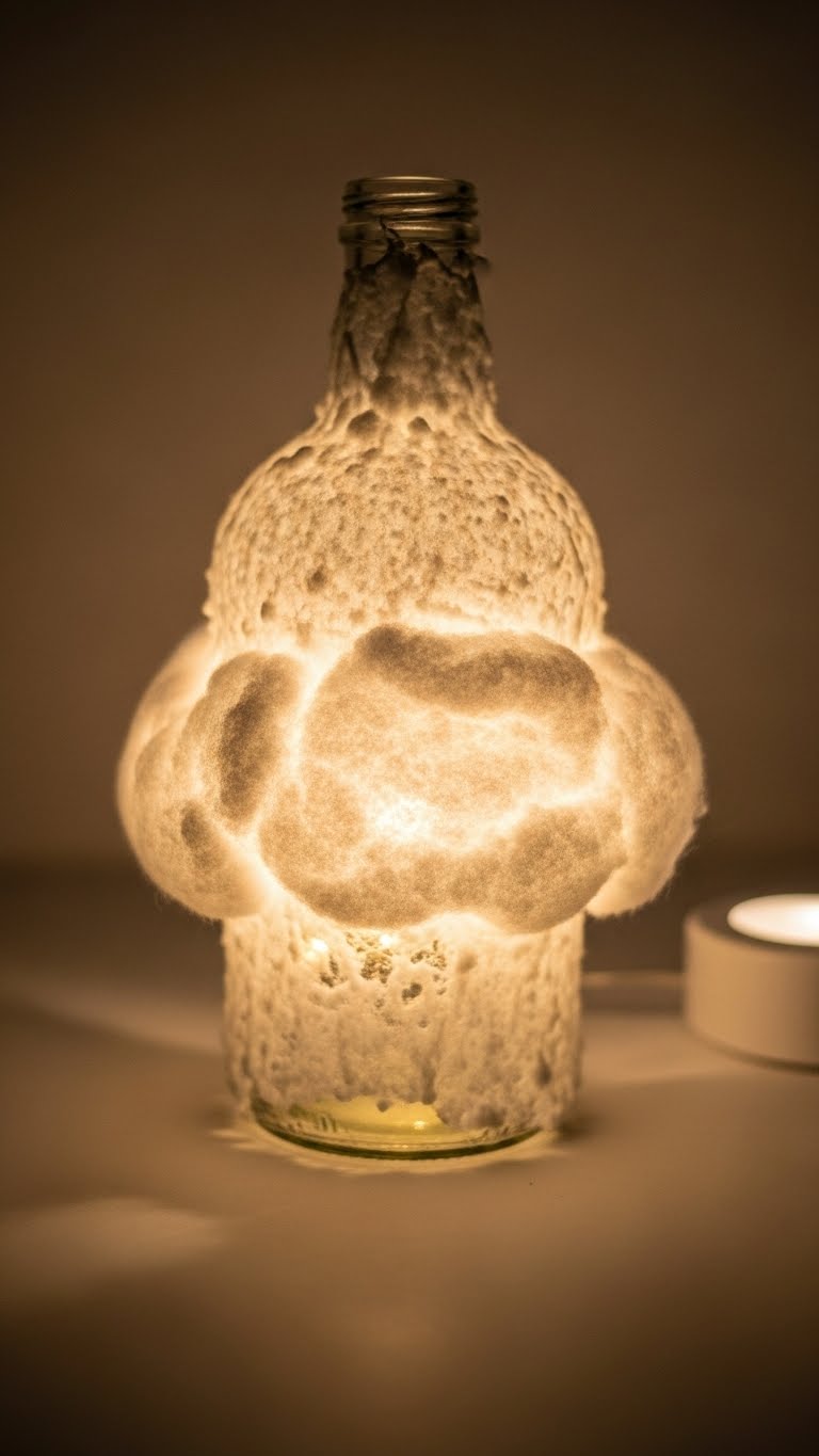 Turn an empty bottle into a dreamy cloud lamp by layering glue-soaked stuffing over its shape and letting light diffuse through soft, textured folds.