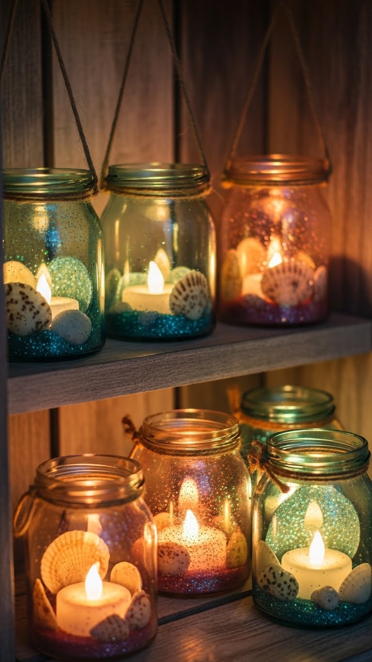 Brighten up your space with colored glass jar lanterns that mix seashells, glitter, and warm LEDs for a seaside-meets-fairytale vibe. You’ll layer a washed shell collection, add soft LED tea lights, and dust iridescent glitter before secure glitter sealing to keep shimmer contained. Hang jars with twine, group them on shelves, and let gentle, portable light free your mood and space.