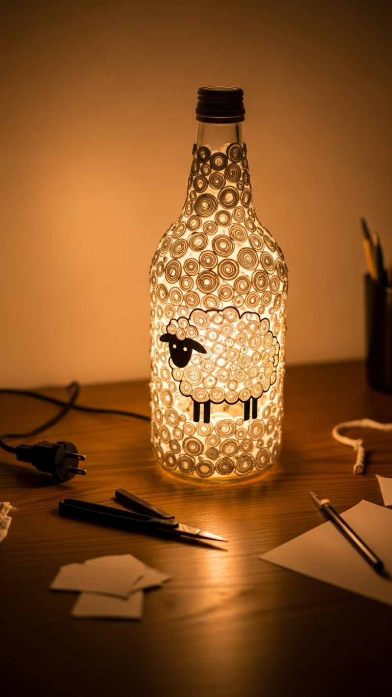Give your desk a soft, whimsical glow with a rolled‑paper sheep bottle lamp that’s equal parts craft and upcycle.