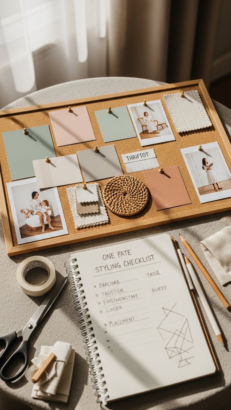 Because a cohesive look doesn’t need to cost a lot, you can pull together a budget mood board that clarifies tone, palette, and materials before you buy a single thing. Pin swatches, photos, and thrift finds to define a soft color palette and textures. Add a 1‑page styling checklist: focal piece, layering plan, budget limits, material sourcing notes, and simple placement sketches.