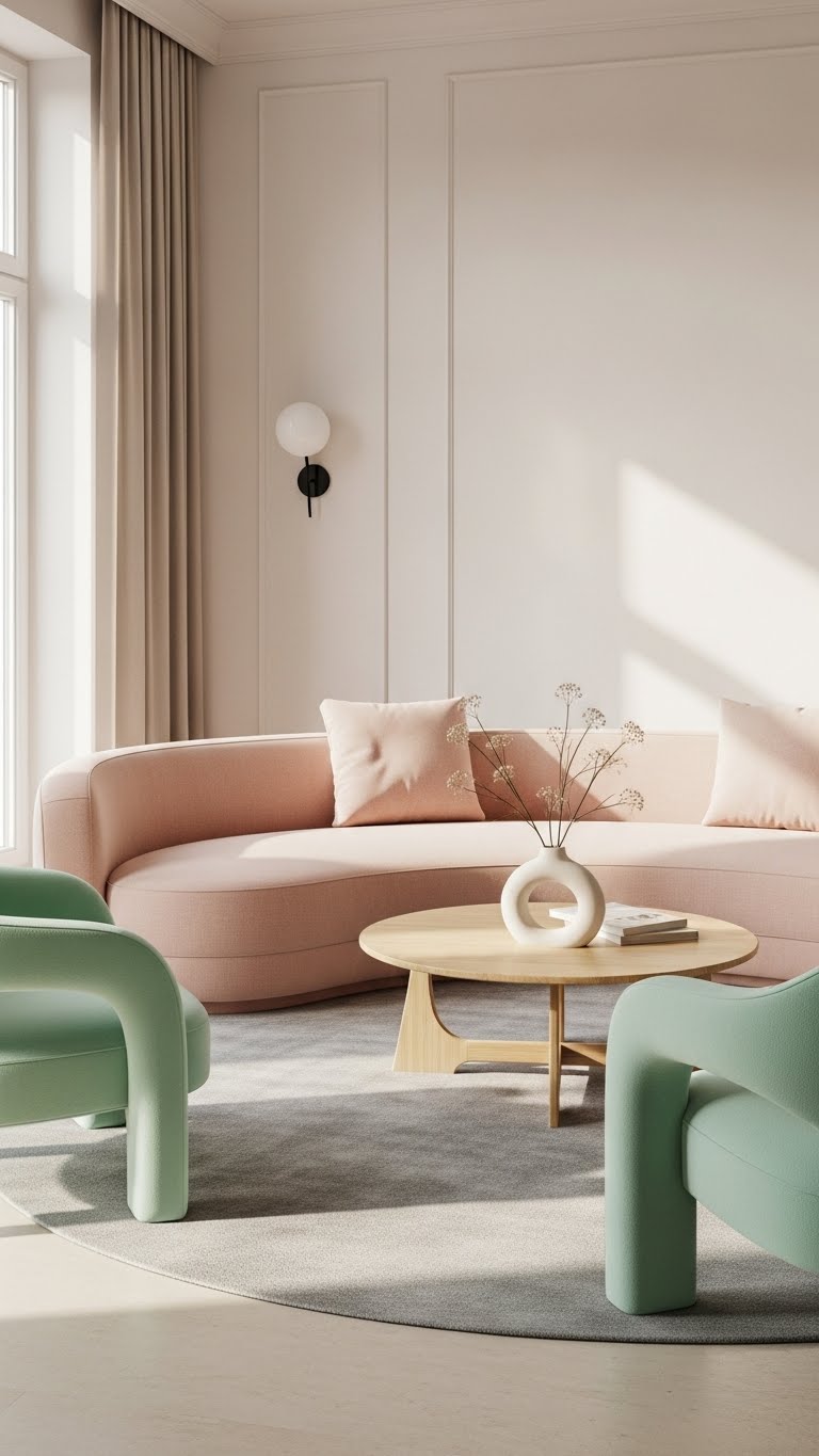 Curved pieces soften pastel rooms. Choose a rounded chair in pale pink.