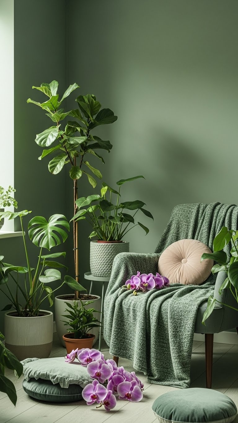 Eucalyptus greens pair with pastels. Use green on walls. Add orchid pillows.