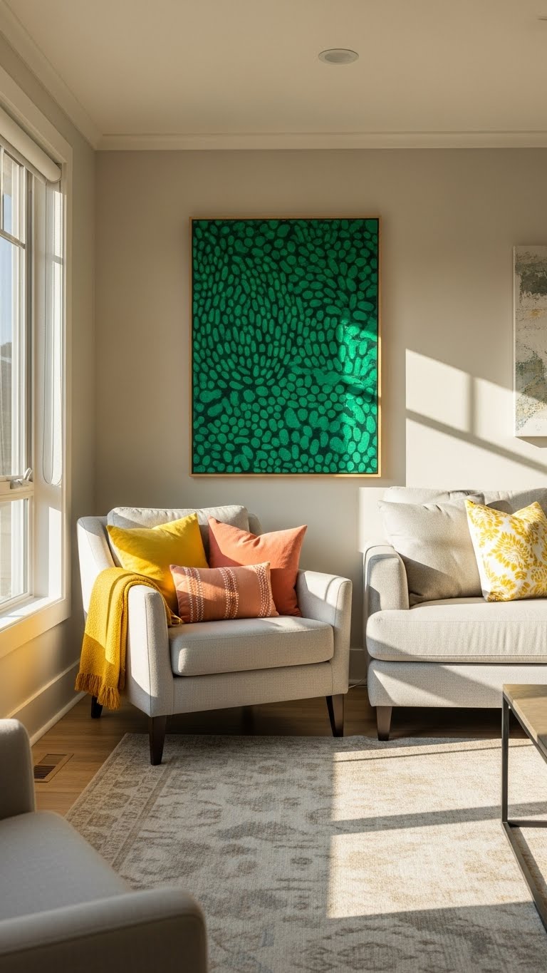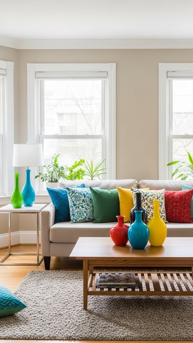 Bright colors like coral and yellow energize your living room fast. Hunt for pillows or throws at budget stores for $10 or less. Pick items that pop against your current setup. Start by swapping one pillow on your couch. This creates contrast without clutter. For a DIY idea, paint a plain frame in coral and add yellow fabric inside. Hang it as wall art. Keep colors in key spots, like corners or shelves. Mix with greens for balance. Rearrange every few days to test the look. These accents make the room lively and fun. Focus on what you already own first. Small changes add up quickly.
