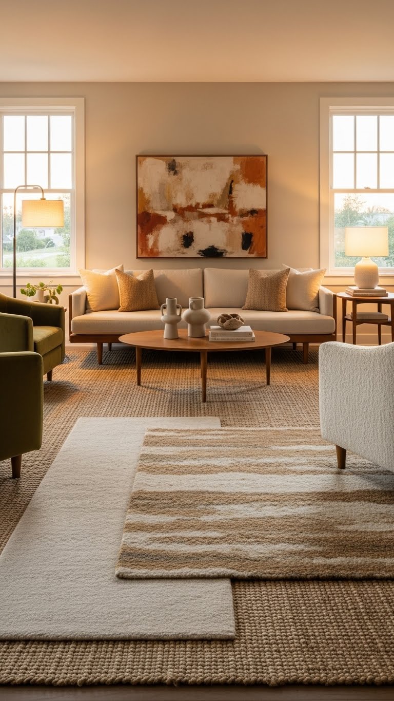 Layered rugs define zones in open spaces with ease. Find a large jute rug as your base, then add a smaller one on top. Shop sales for options under $30. Place the bigger rug under your coffee table first. Layer a patterned one in the center. For a DIY touch, trim edges with fabric scissors for a custom fit. This adds warmth and separates areas like seating from walking paths. Experiment with overlaps for the best flow. Keep colors neutral to match your decor. These layers make the room feel cozier. Try different combos to find your favorite.