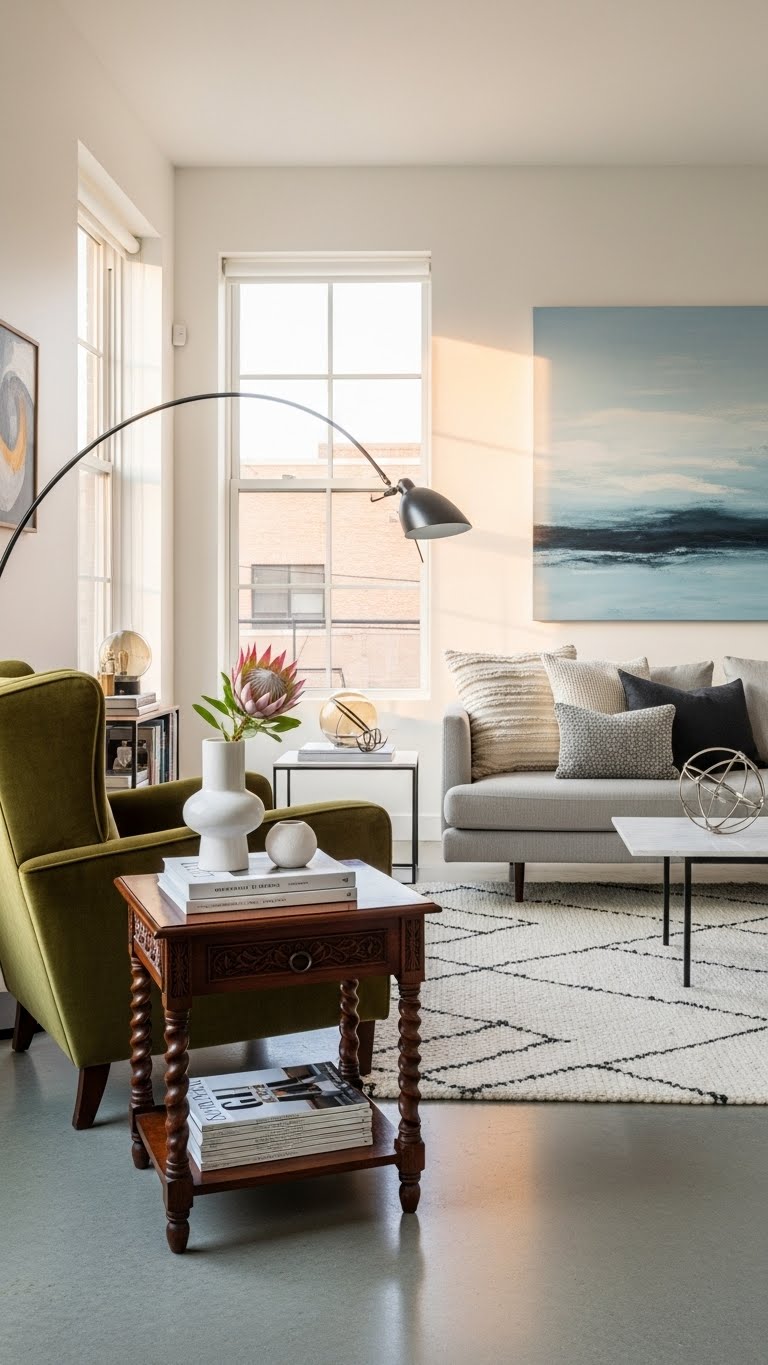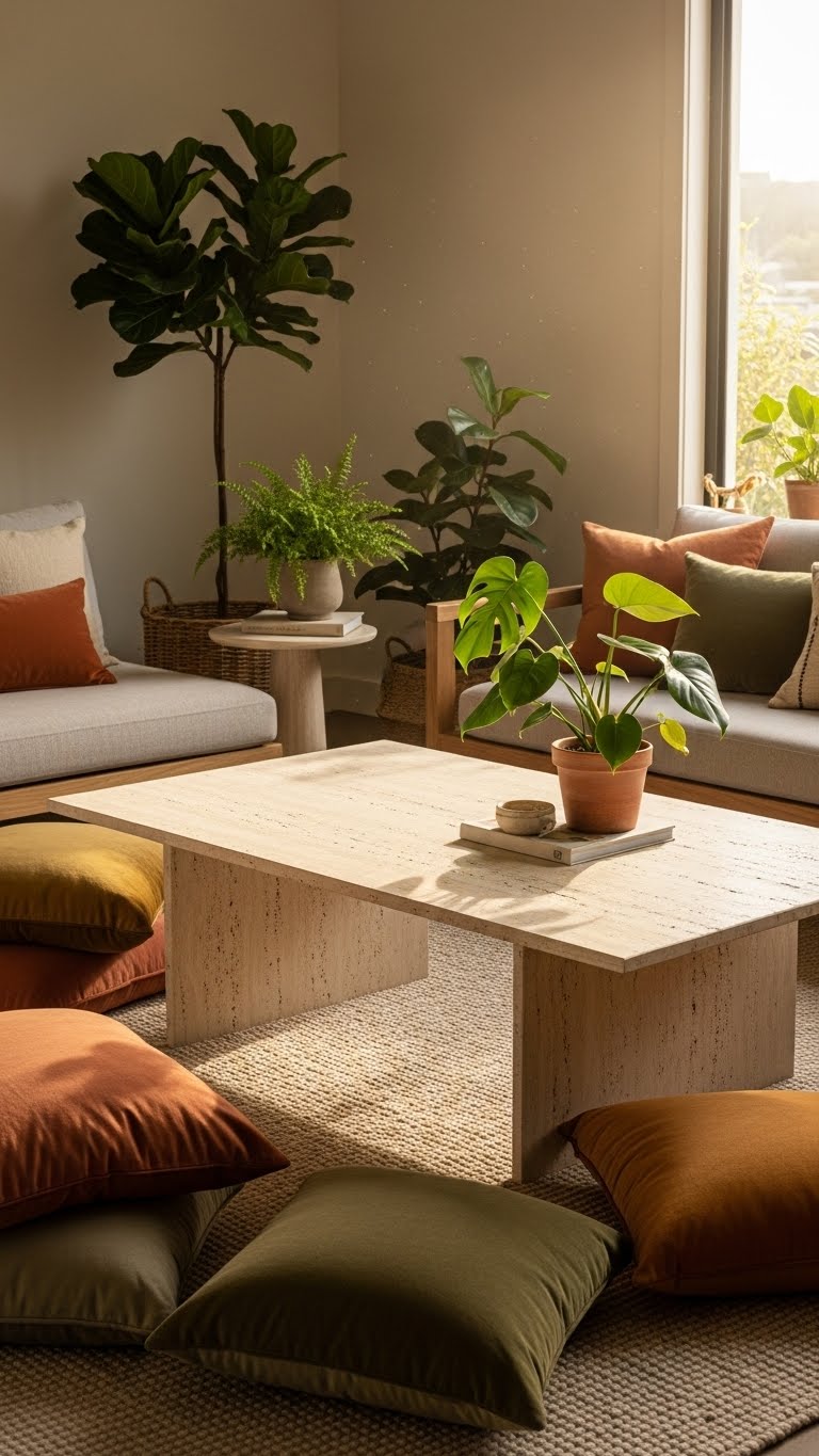 Travertine tables ground your living room naturally. Look for one second-hand. Set it in the center. Start by clearing space. For DIY, paint a table top. This adds weight. Style with plants around. These pieces anchor the room.