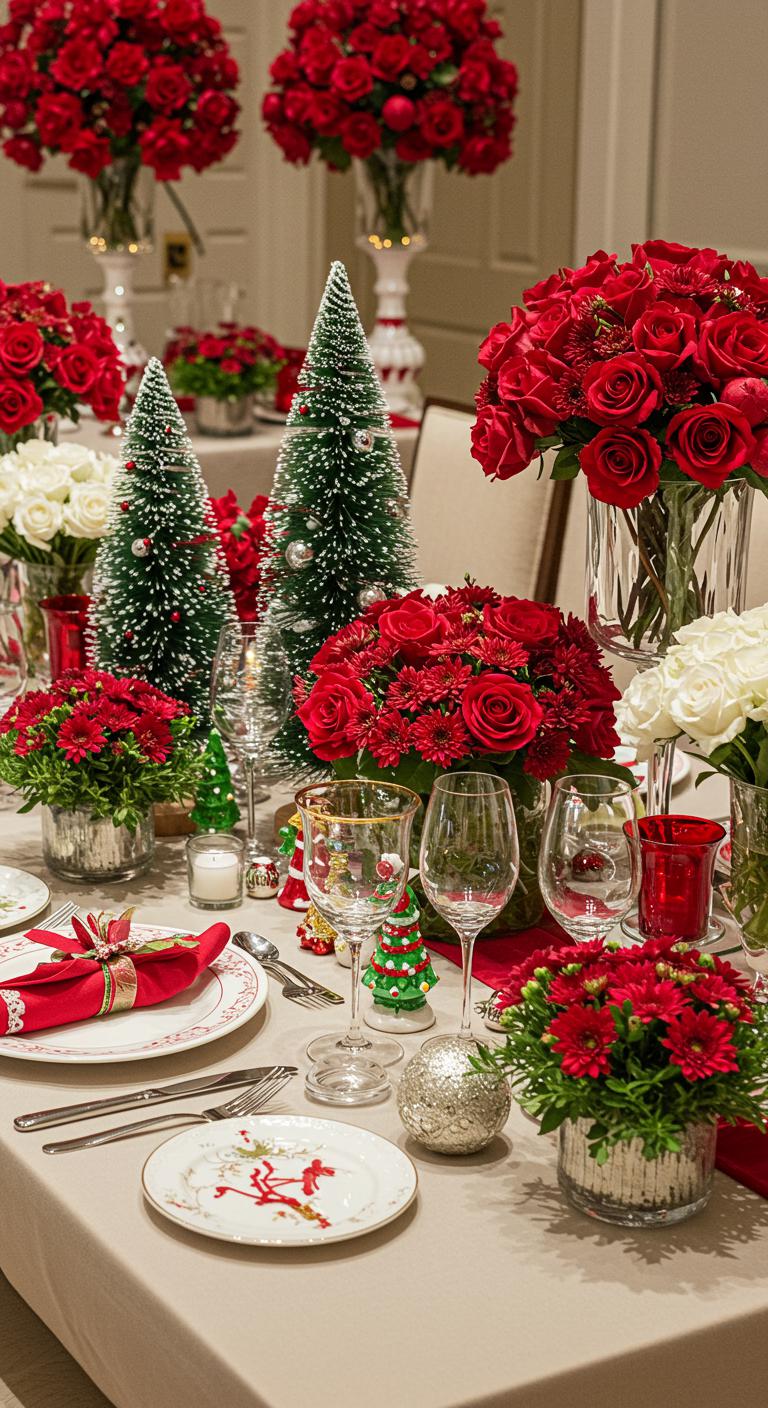 Consider vibrant holiday floral arrangements, bursting with reds and whites, or opt for whimsical centerpiece ideas featuring playful decorations like miniature trees or sparkling ornaments.