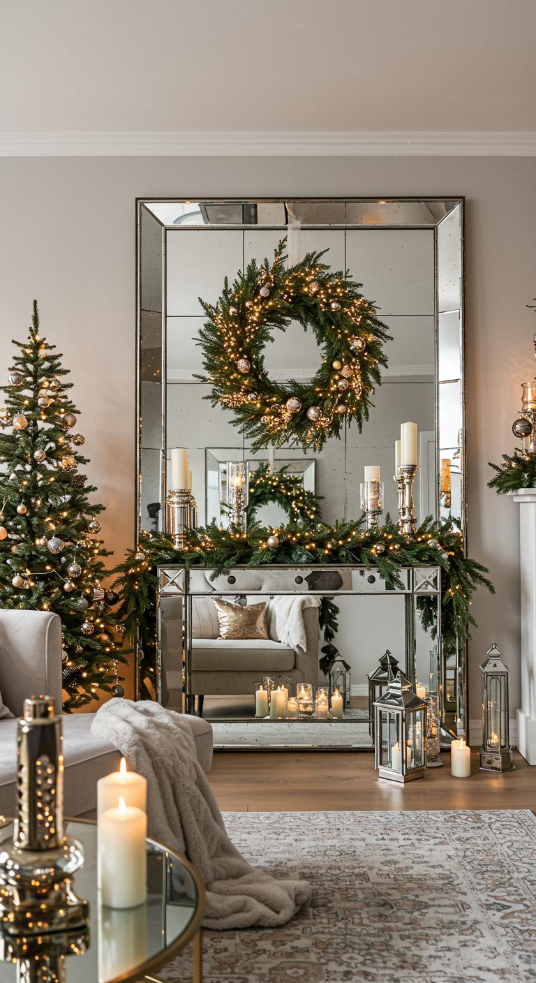 Consider incorporating mirror wall decor to create a stunning focal point. Reflective holiday accents, like decorative mirrors adorned with festive wreaths, amplify light and warmth, making your home feel more inviting.