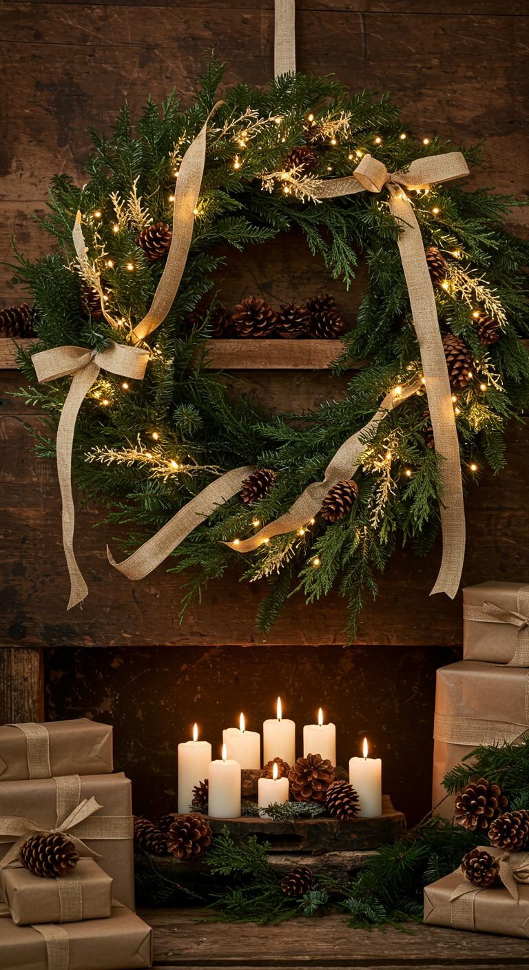 Use evergreen wreaths as stunning focal points, draping them with twinkling lights or ribbons.