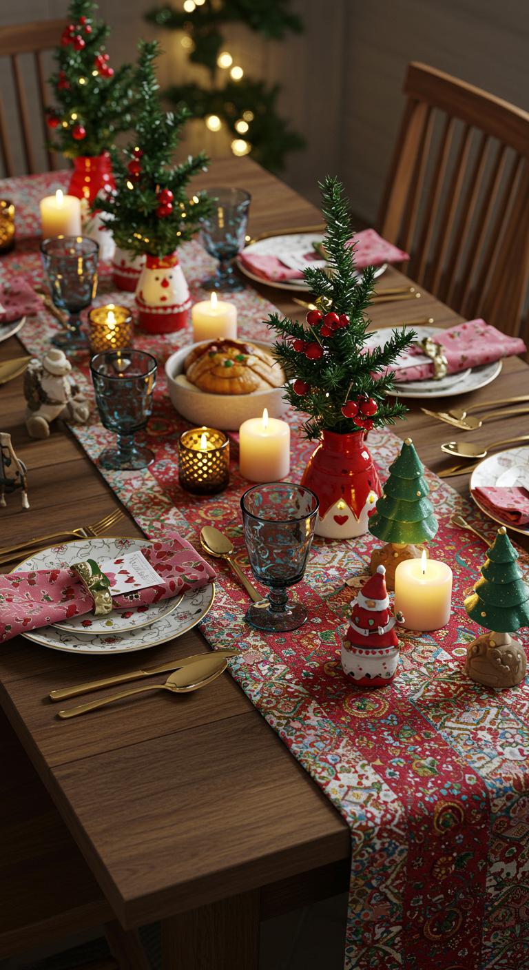 Use vibrant festive table runners to bring your table to life, while holiday themed centerpieces can add a whimsical touch.