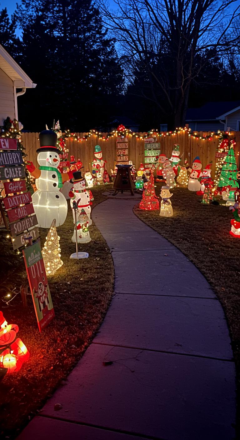 Add inflatable decorations and whimsical snowman creations, while seasonal greenery and holiday sculptures create a charming atmosphere.