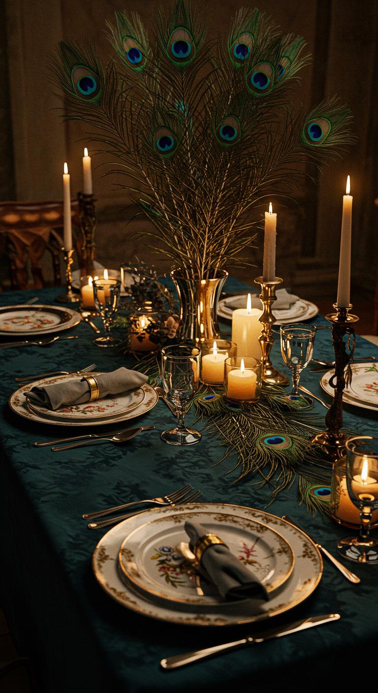 • Mystical Centerpiece: Create a centerpiece using natural elements like peacock feathers, dried flowers, or even a faux crystal ball. Surround this with small candles and gems for an elevated aesthetic.
