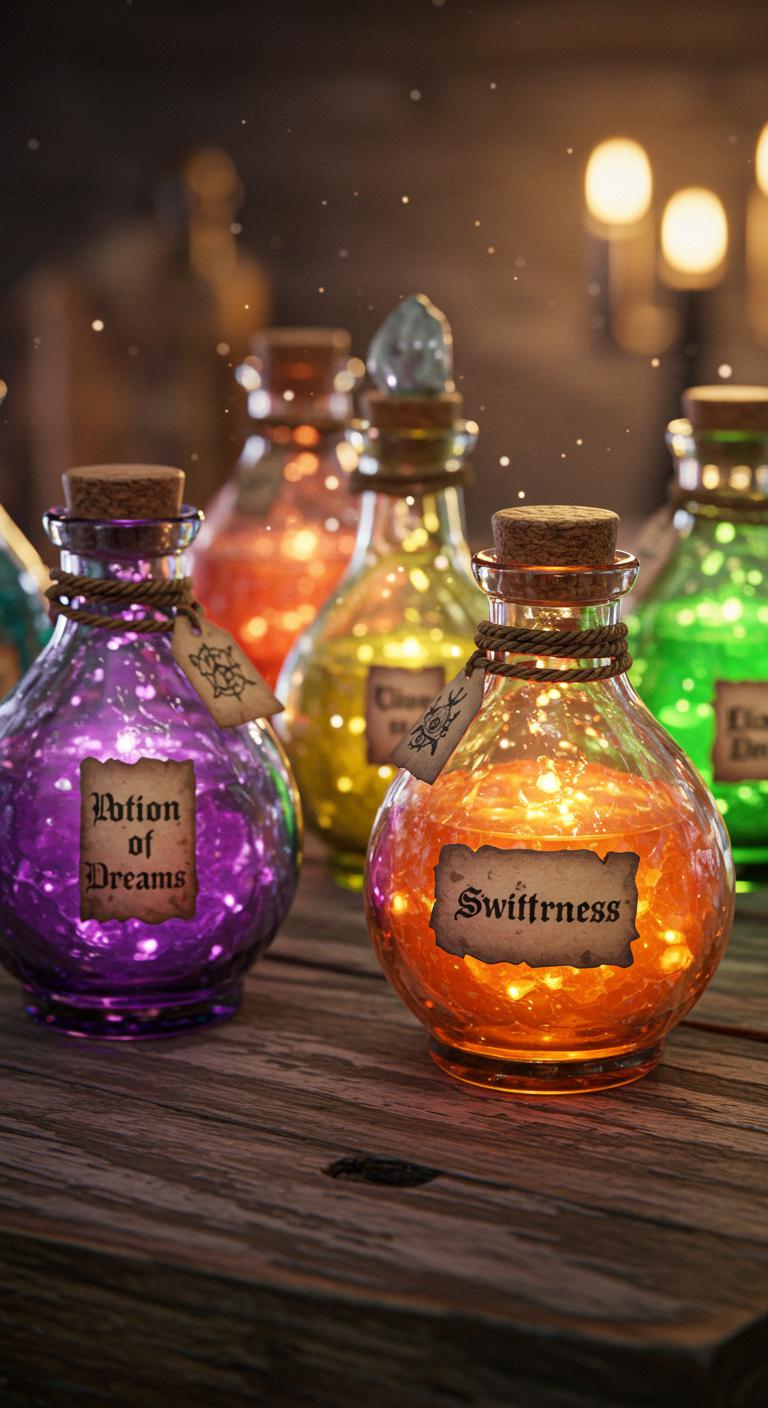 • Potion Bottles: Use old glass jars or bottles filled with colored liquids (e.g., colored water or sparkling juices) as decorative accents. Label them with playful names for a fun twist!