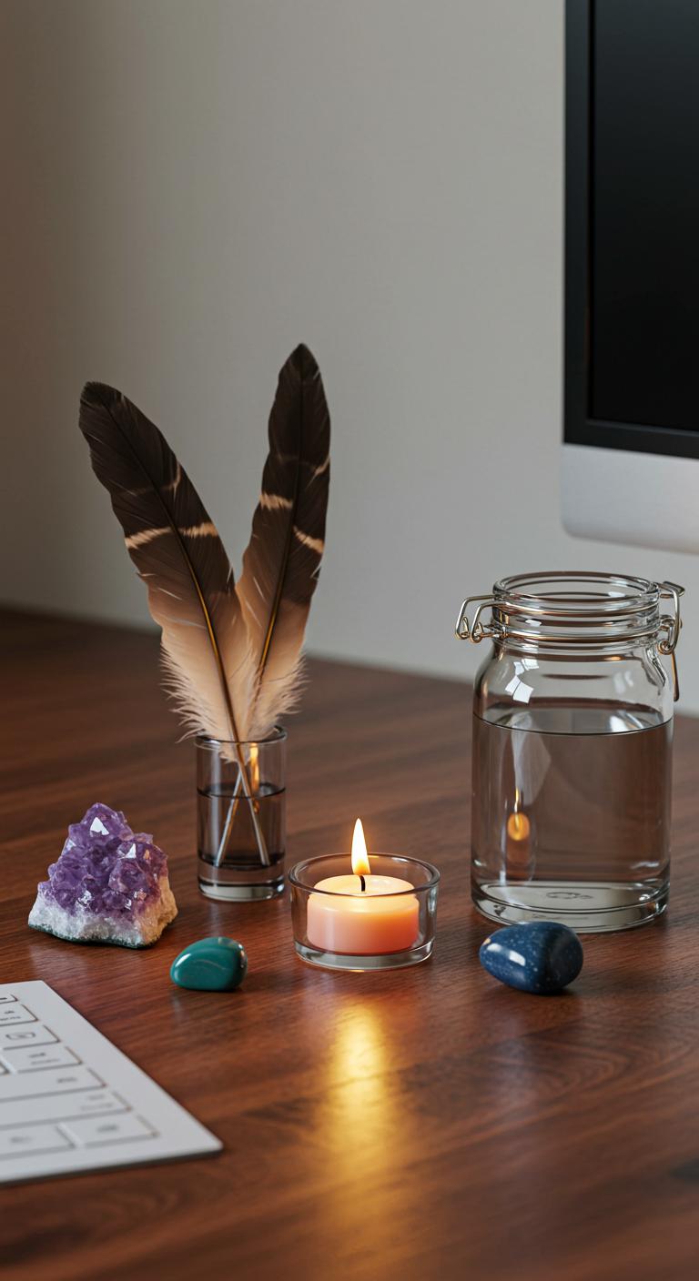 Incorporating elemental representations can enhance your space’s energy. Choose items that symbolize earth, air, fire, and water. For earth, add crystals; for air, opt for feathers; fire can be represented by candles; and water by a small bowl. Place them strategically around your workspace. This simple collection can create a balanced atmosphere. You don’t need to spend much—use what you already have or find cheap items that represent each element.