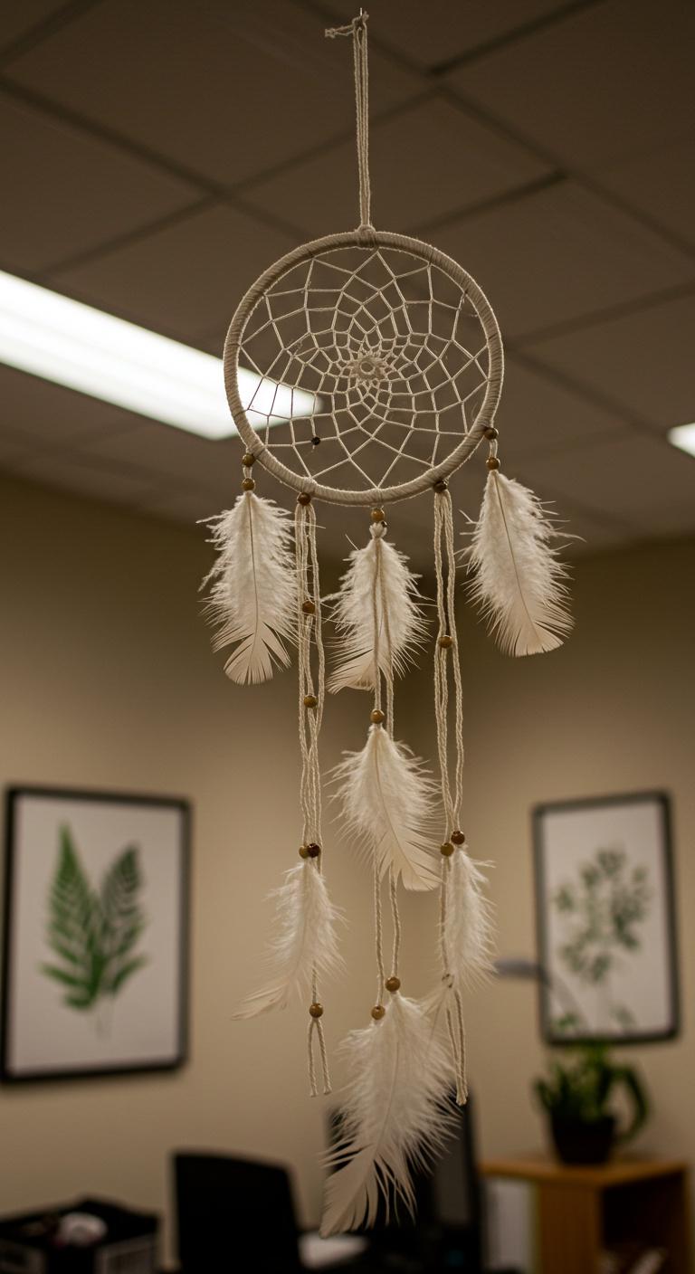 Consider incorporating a dreamcatcher. They add texture and artistic flair to your office. You can hang your dreamcatcher near your workspace or in a window to catch the light. Making one can be a fun DIY project. All you need are a hoop, some twine, and feathers. Personalize it with your favorite colors or charms. It’s a stunning way to embrace creativity while adding a spiritual element to your office.