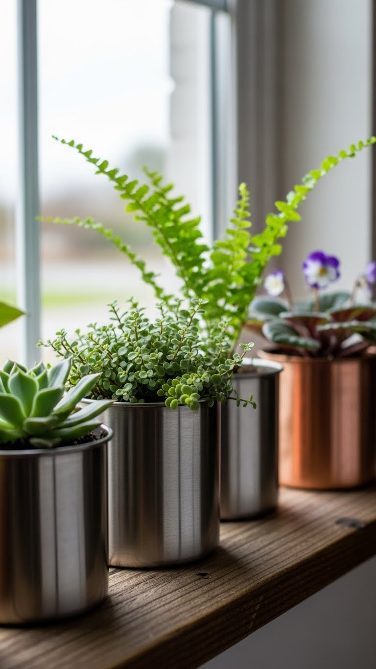 Repurpose metal cans as planters. Add soil and plants quickly. This gives a modern edge. Use for herbs or flowers. Cost? Free with scraps. Display indoors or out.