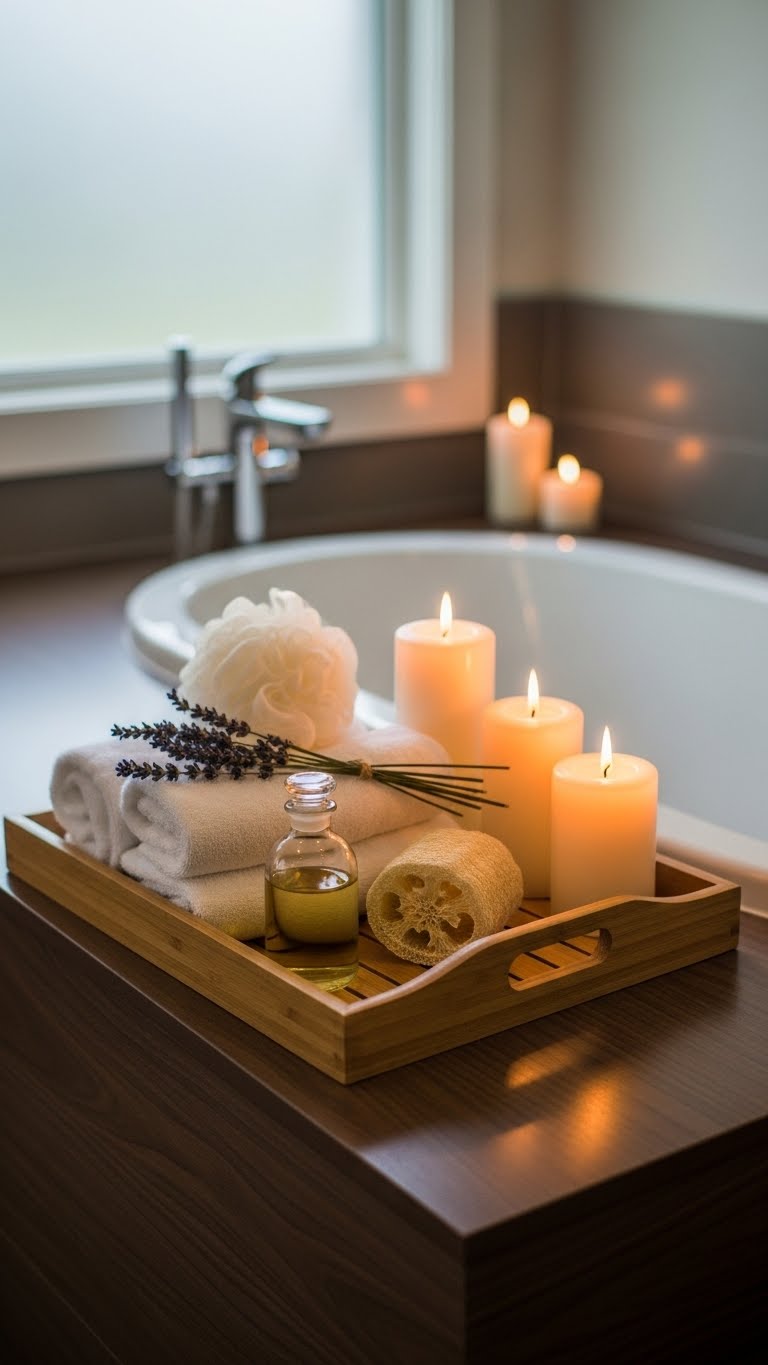 Put together spa essentials. Use soaps and oils you have. Set up in your bath. Relax with music. This is easy and cheap at $6.