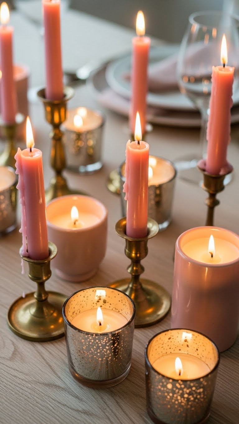 Candles set the mood affordably. Pick pink ones at stores for $2 each. Place on tables for ambiance. Your space will warm up nicely. Use safe holders to prevent issues.