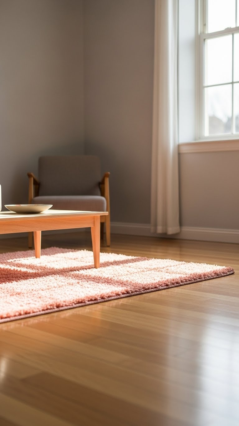 Add a small rug for floor color. Find one online for $15. Lay it under furniture. DIY: Paint a plain mat. Your floors will pop subtly.