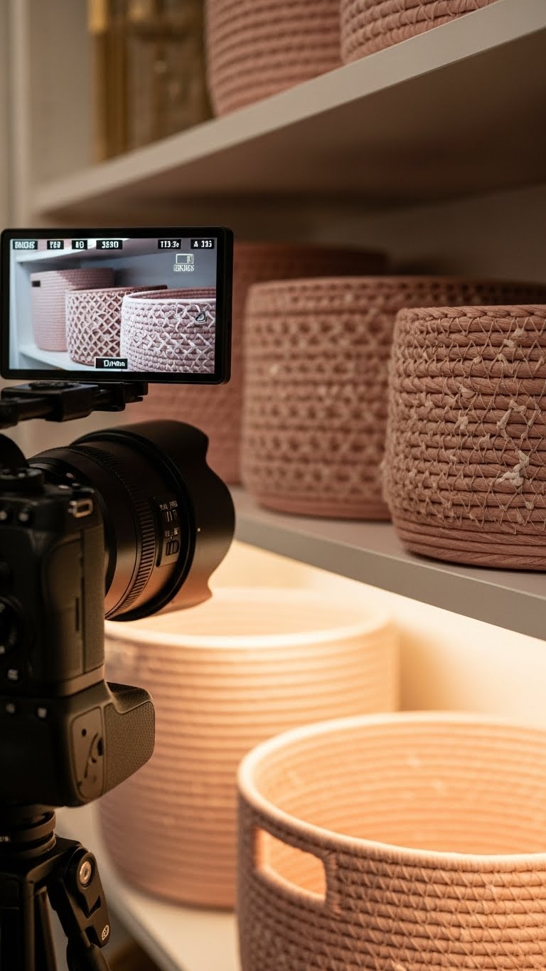Baskets organize with style. Get them for $8. Fill and place. Your storage will look better.