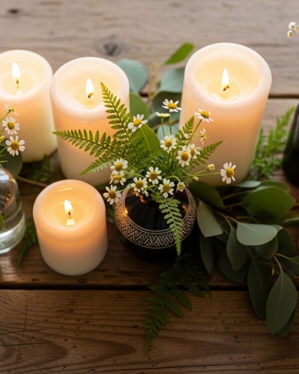 Three candles on a wooden tray piled with eucalyptus – simple, fresh, stunning. That greenery pop? Obsessed. I keep one on my coffee table daily; it smells amazing and hides clutter. Easy win for you.
