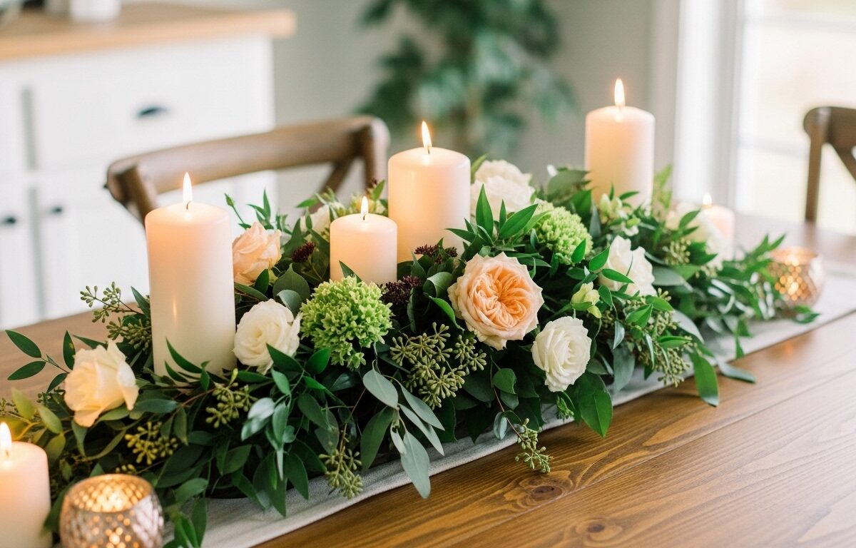Flowers weaving through place settings – elevates the whole table. Did this for my anniversary dinner; hubby was impressed. Mix wildflowers for that just-picked charm. You’ll feel like a hostess pro.