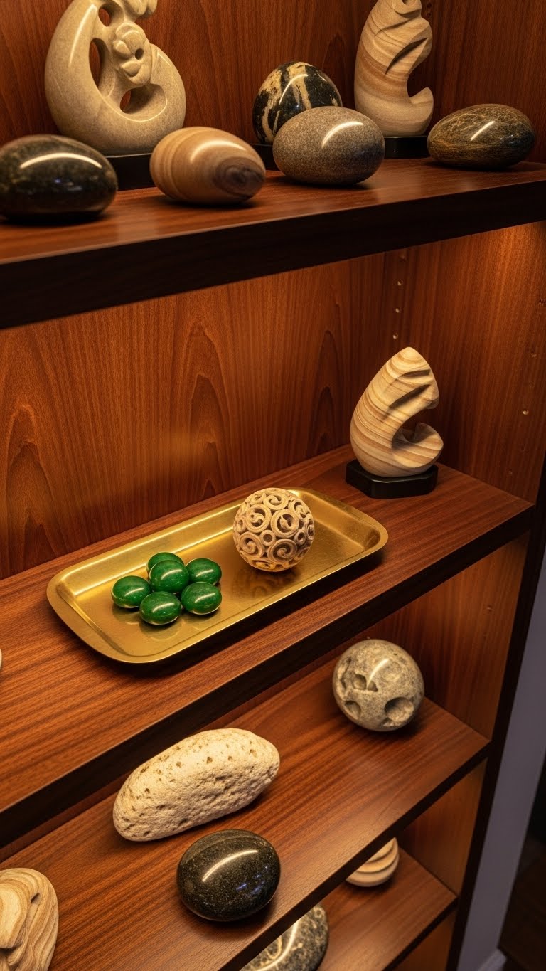 Dark woods anchor a room. Add a wooden tray or frame. DIY example: Stain a thrift find. Look for sales online. Layer with metal accents. Place on a table or wall. It adds stability. Focus on natural tones. Your home feels rooted. Try it in your main area.