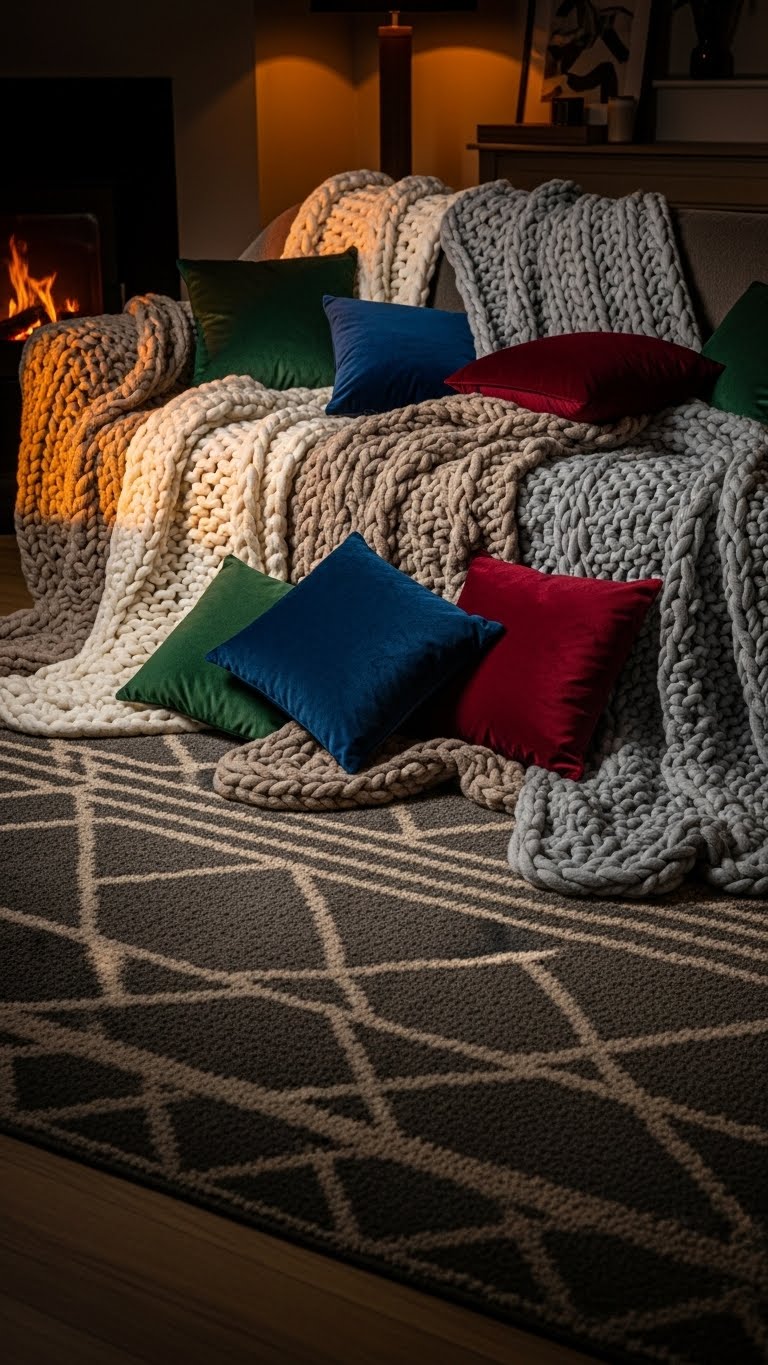 Knits and fabrics create hugs. Drape a blanket over your chair. DIY tip: Crochet a simple cover. Use old yarns. Layer from floor to furniture. Start with a rug. It builds comfort. Keep layers light. Your space invites rest. Add one piece now.