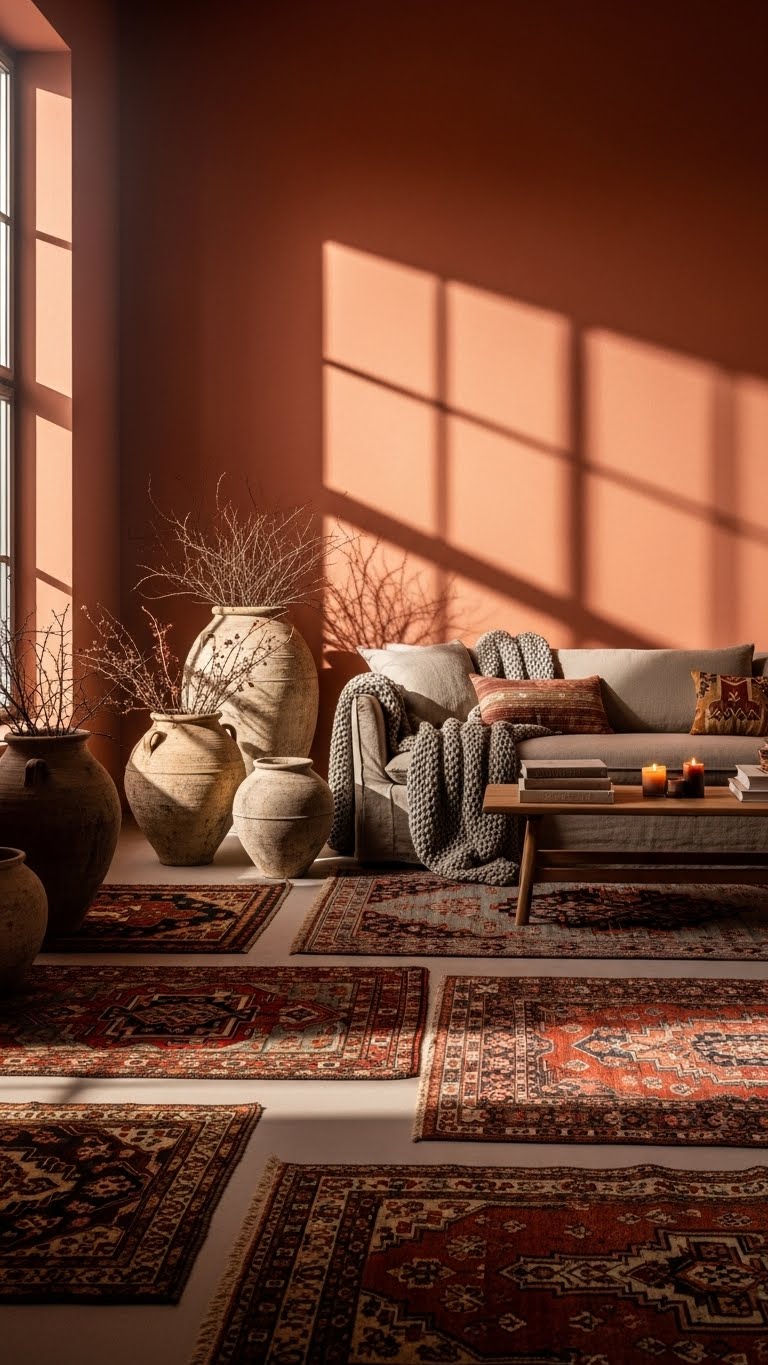 Terracotta shifts with light. Add pots or tiles. DIY idea: Paint a vase. Use affordable clay. Layer on shelves. Put in sunny spots. It grounds the room. Focus on light play. Your space feels alive. Start with one item.