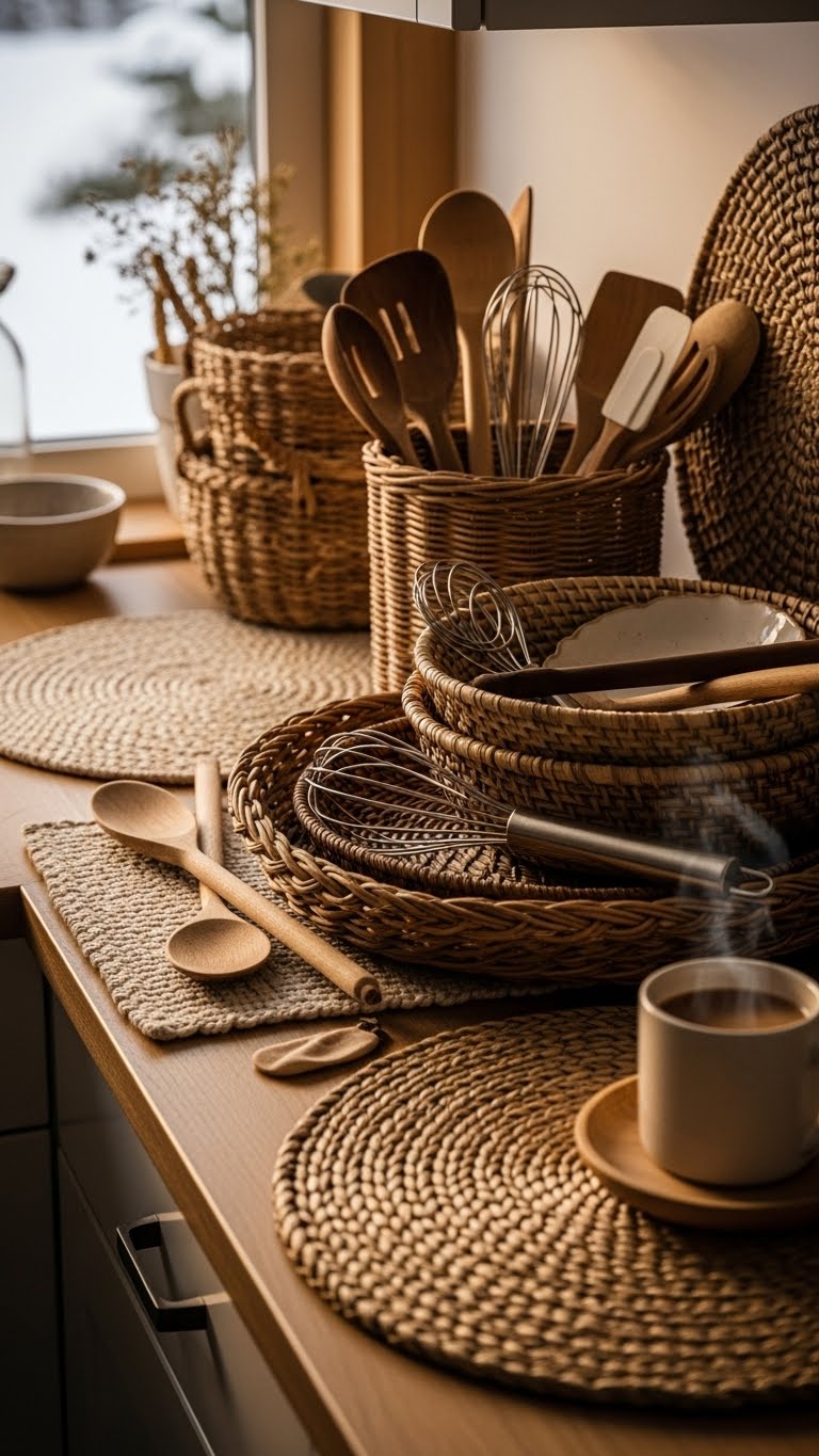 Soft textures in kitchens work well. Add mats or baskets. DIY idea: Weave a trivet. Find cheap fabrics. Layer on counters. Place near appliances. It enhances use. Focus on touch. Your kitchen invites cooking. Try it out.