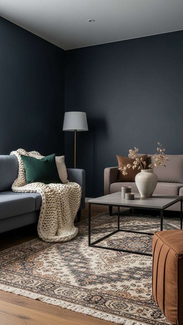 Earthy colors like taupes and soft greens add a gentle warmth. Paint an accent wall or add a throw in these shades. It’s straightforward and affordable. DIY tip: Mix paint from leftovers for a custom hue. Layer with a rug in similar tones. Place it under your coffee table. This ties the room together. Keep it light. Use two or three colors max. Update pillows or curtains for quick changes. Your home will feel fresh yet calm. Try this in a small room first. It makes a big impact.