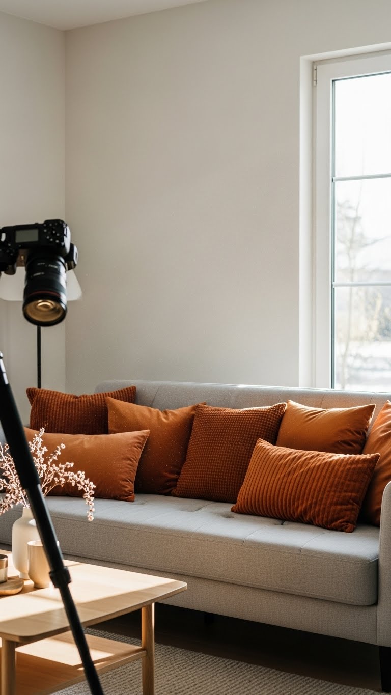 Bright colors stand out. Add a pillow in orange. DIY idea: Tie-dye a cover. Use sales finds. Layer on bases. Put in seating areas. It sparks joy. Keep pops small. Your room gains energy. Add one now.
