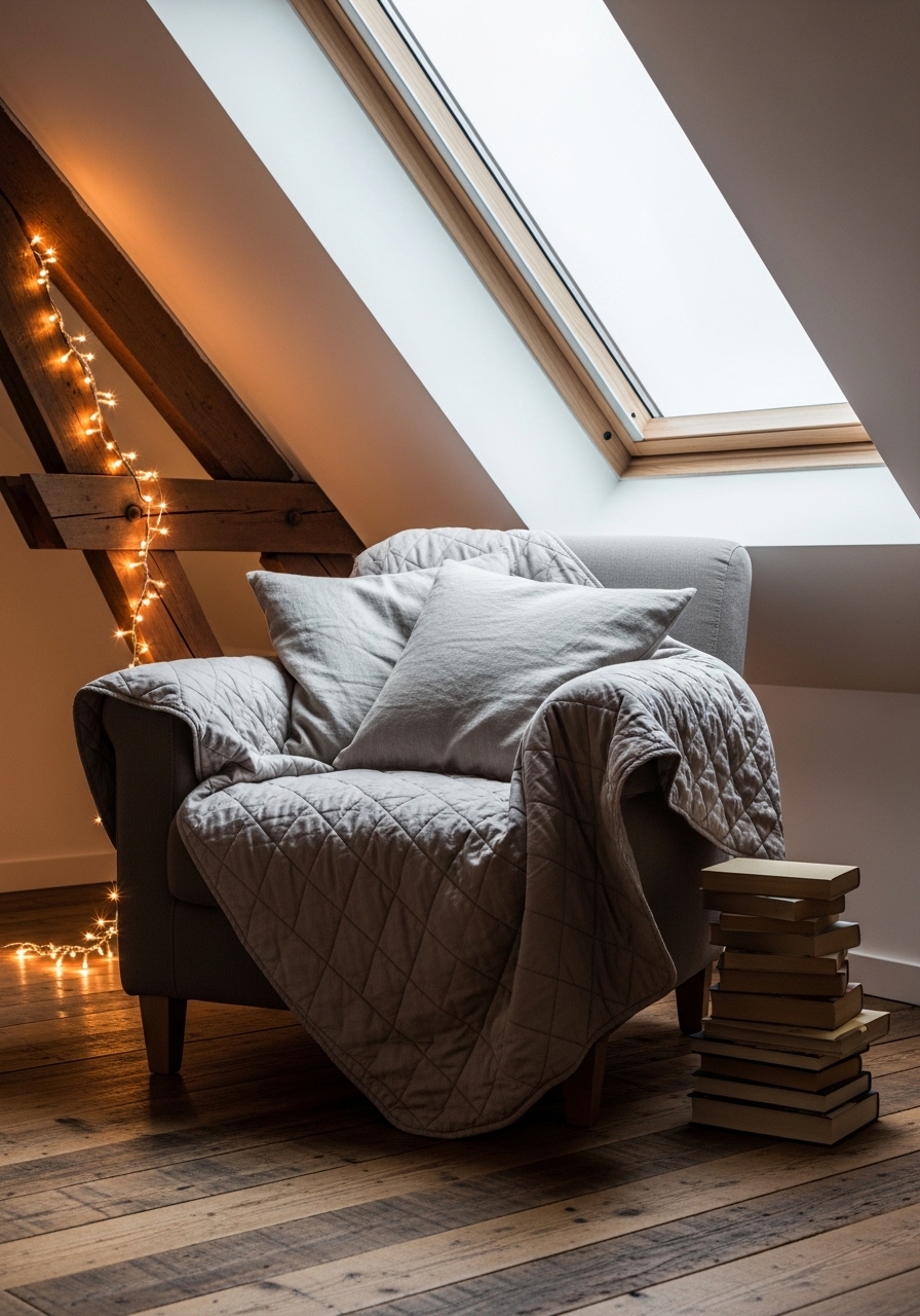 An attic corner with a comfy chair and books turns unused space into a retreat. Last summer, I cleared mine out and added this setup – perfect for escaping with a novel. The sloped ceiling adds that quirky farmhouse charm.