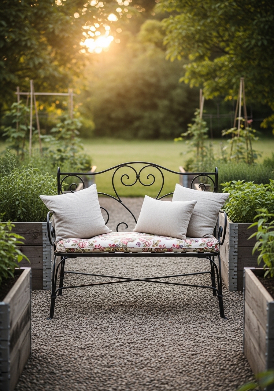Creating a garden seat with metal furniture and plants extends the farmhouse feel outdoors. I set one up by my veggies, and it’s my morning coffee spot. Adds a peaceful extension to your home.