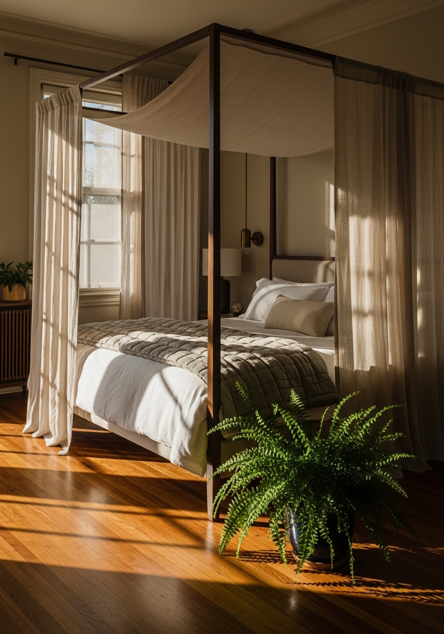 A canopy bed with light fabrics elevates a bedroom to romantic farmhouse heights. I dreamed of this for years and finally got one – sleeps like a cloud. Pair with neutral walls for balance.