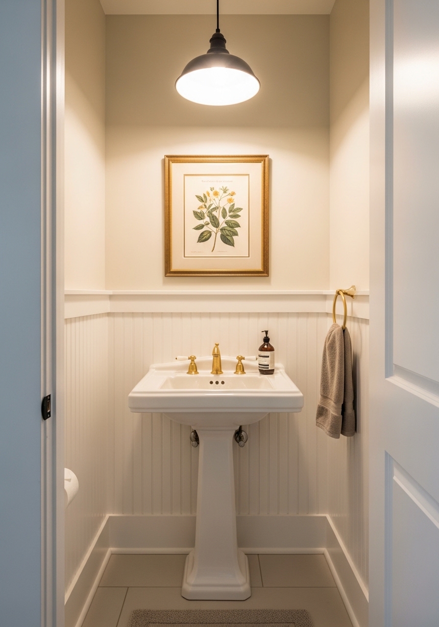 A tiny powder room with vintage fixtures and prints feels special for guests. I updated mine with beadboard, and it’s a quick project with big impact. Keeps the traditional vibe in small spaces.