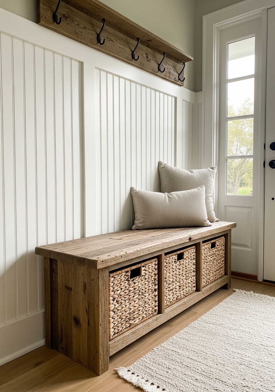 You know how entryways can feel so blah? I spruced mine up with a simple bench like this, sourced from leftover wood scraps, and added baskets for shoes – all under $20. It keeps things organized and gives that welcoming farmhouse feel right when you walk in, plus it’s great for sitting to lace up boots on rainy days.