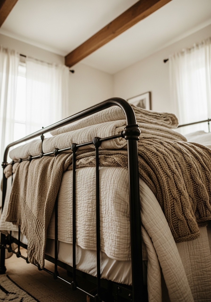 Layering textiles on your bed is an easy budget win for farmhouse bedrooms. I scored quilts at thrift shops and mixed them with pillowcases I sewed from old fabrics – it feels luxurious and cozy, especially on chilly nights. No need for new bedding when you can repurpose like this.