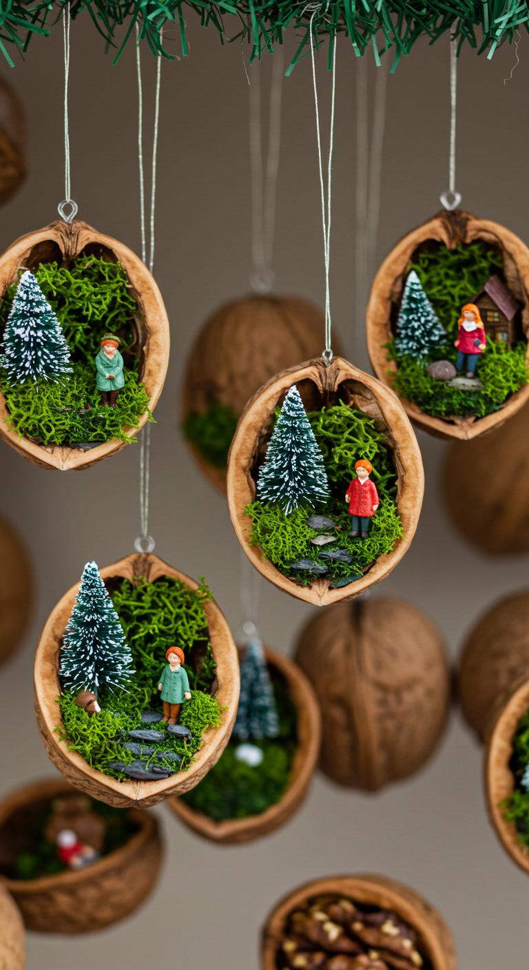 Pick a walnut half, clean its shell, and imagine a tiny world you can hold in one hand—miniature scenes are surprisingly simple and endlessly charming. Glue moss base, add pint-sized figures or painted trees, and seal with matte varnish. Use walnut scene ideas to vary themes; employ miniature display techniques like recessed hooks or clear thread. Hang, gift, or nestle in a wreath.