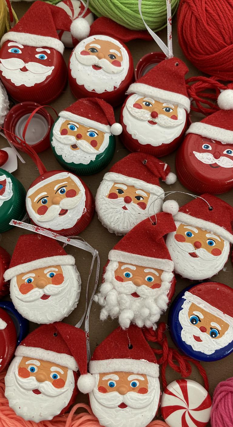 After you’ve wrapped yarn candy canes, try turning tiny bottle caps into jolly Santa faces for a playful, pocket-sized ornament.