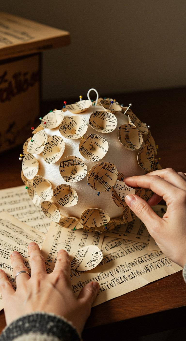 If you love the timeless look of old carols, start by gathering yellowed sheet music, a plain foam ball, and a stash of straight pins so you can transform faded pages into a charming vintage sheet music ball. Tear pages into petals, overlap them neatly, pin each row, smooth edges, and leave a loop for hanging — celebrating musical heritage and vintage aesthetics with freeing, hands-on joy.