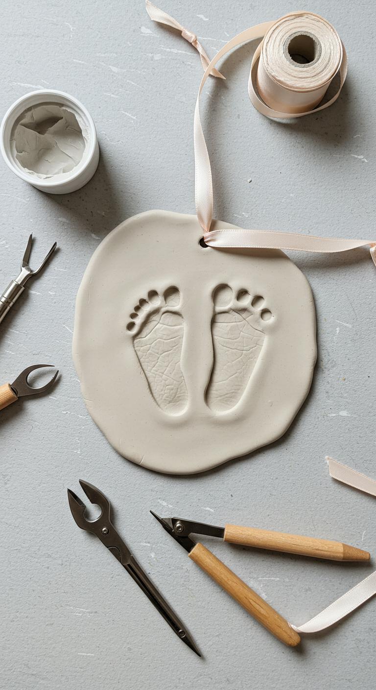 Use baby footprint techniques to center detail; follow clay ornament tips for sealing. Tie ribbon and hang proudly.
